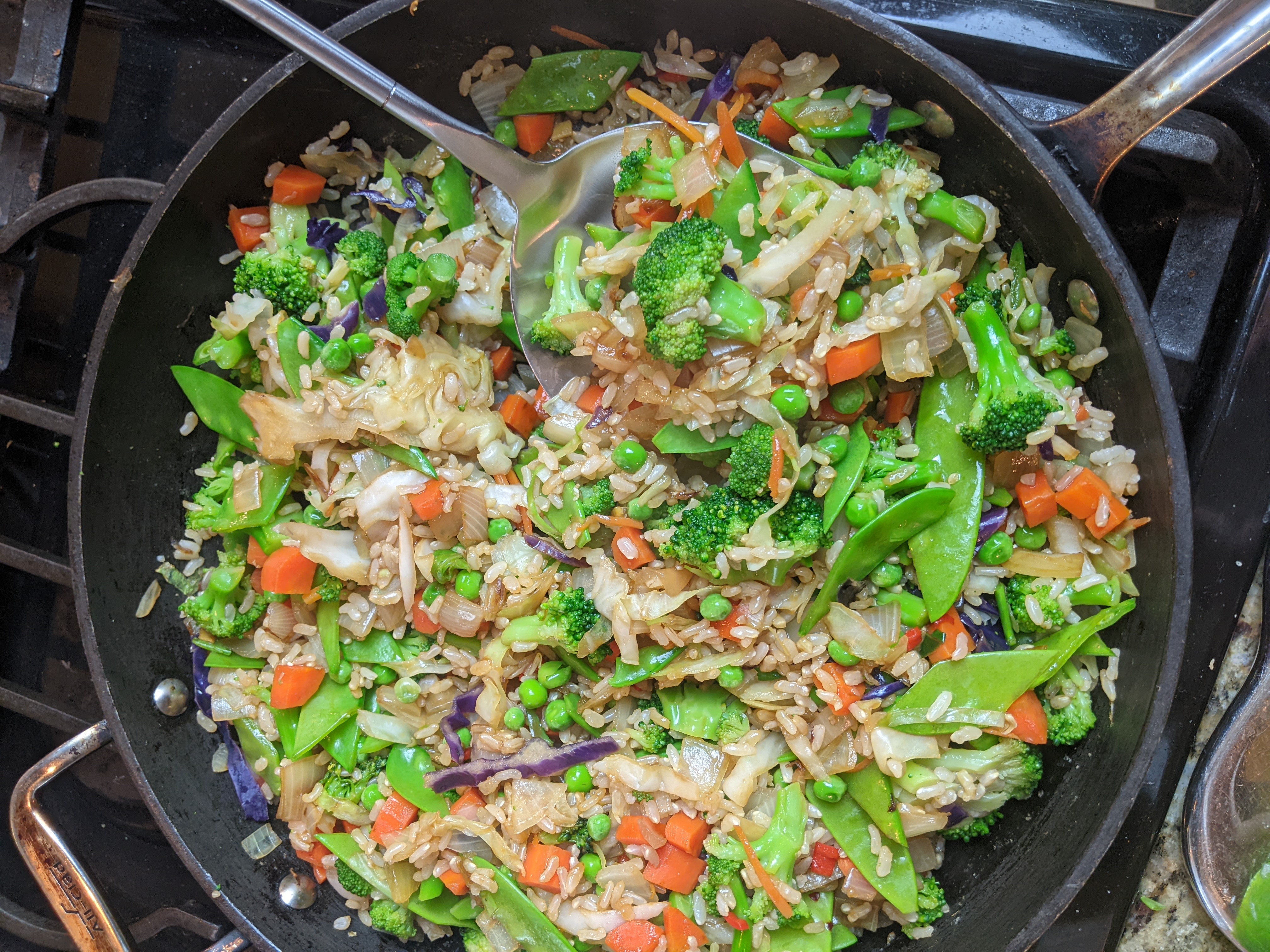 - Use a Big, Wide Pan: This will help you keep the ingredients moving around and cook quickly. You want to saute the vegetables and rice, keeping some crunchy texture. If you use too small of a pan, it might be overcrowded and your vegetables will steam…making them soggy.
