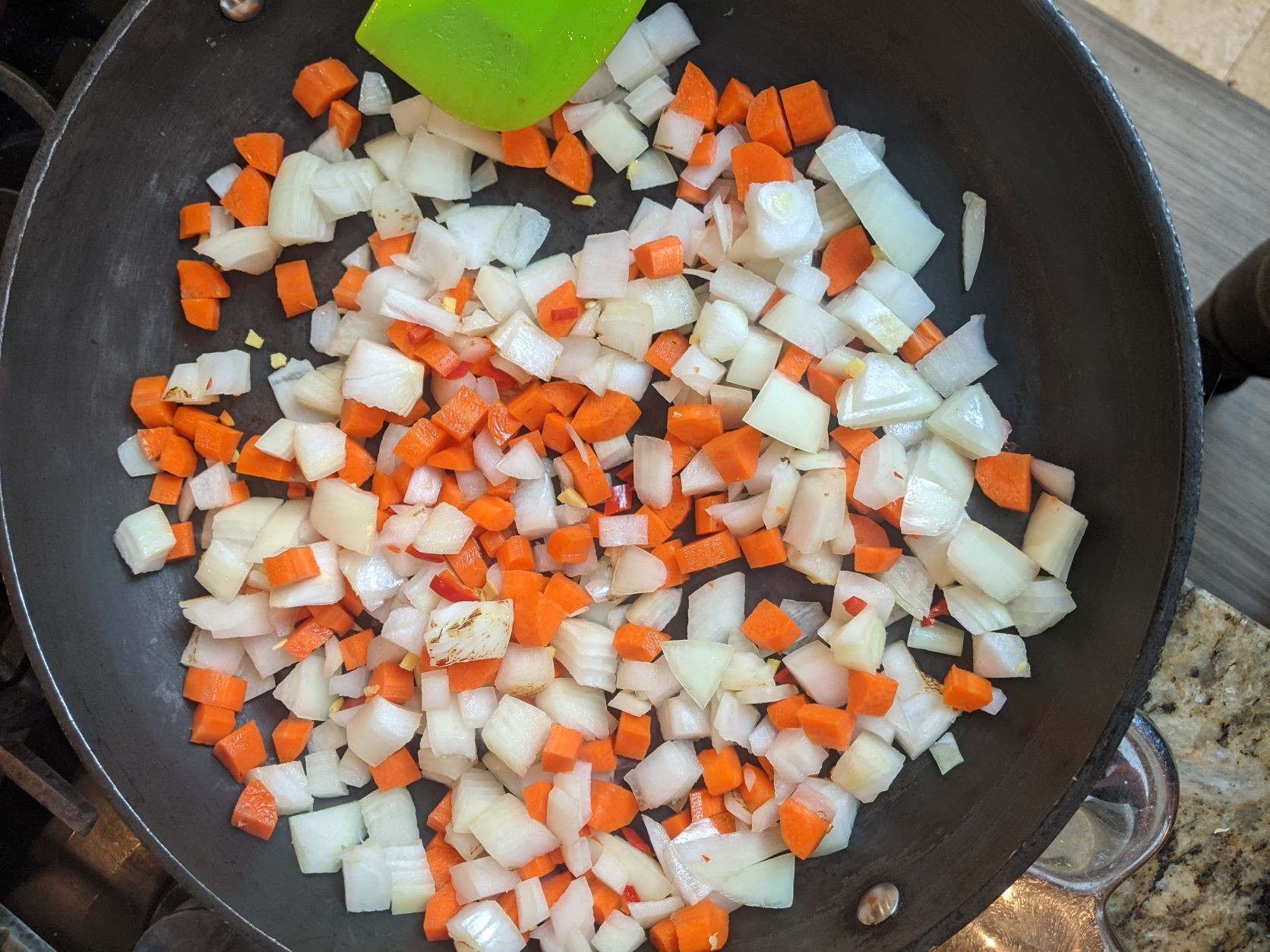 - Add the onion, carrot, chili, and ginger to the pan. Cook, stirring often, until the onions start to soften, about 5 minutes. Add the garlic and cook 30 more seconds, stirring often.