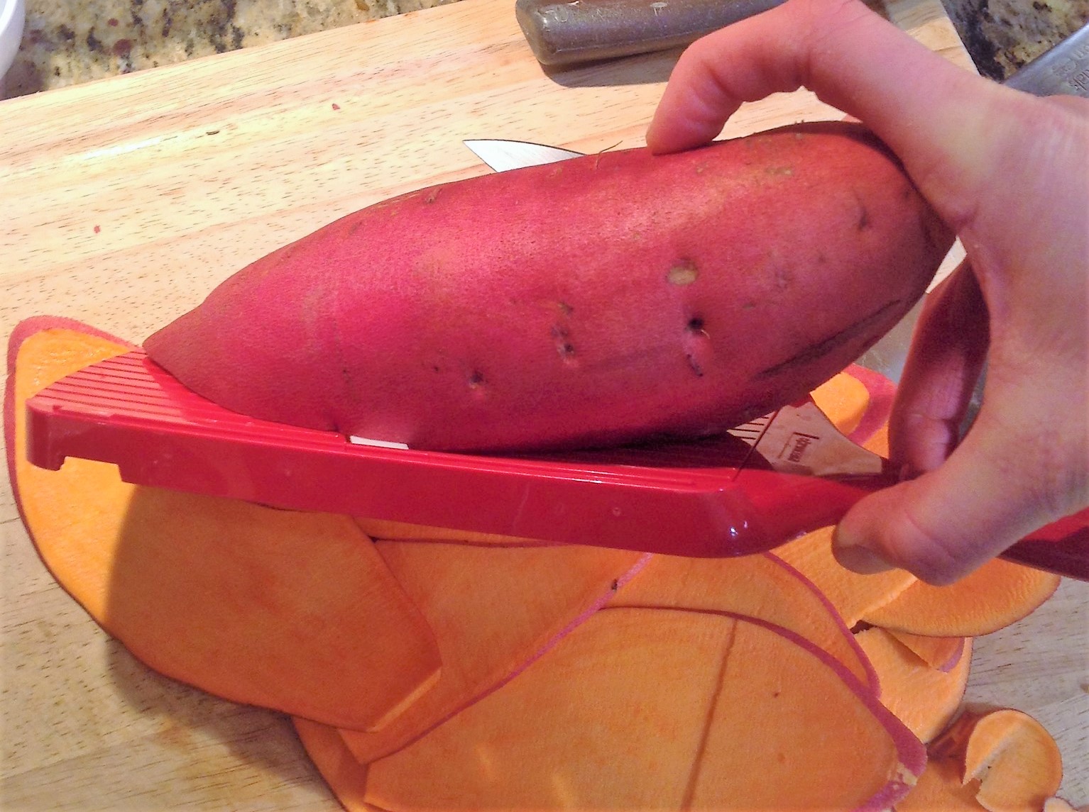 - Use a mandolin to thinly slice the sweet potatoes into “sheets”. I use a Japanese-style mandolin and set it on thickness “3”. Submerge the noodles in water and keep them covered in water until ready to assemble. This will prevent the sweet potato from oxidizing and turning brown.