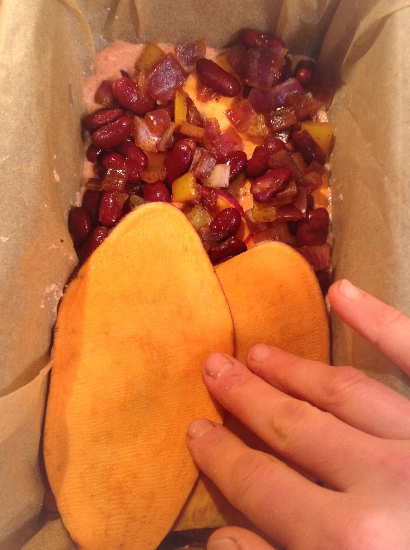 - Pour a layer of the Fire-Roasted Cashew Chili Sauce in the bottom of a 9×9″ baking dish (about 1/2 cup). Spread one layer of the sweet potato noodles. Try to keep the sweet potatoes in a single layer as much as possible. Spread 1/4 of the Oil-Free Red Kidney Bean Filling on top of the noodles. Spread 1/4 of the Vegan Macadamia Nut Ricotta “Geez!” on top of that. Add another layer of sweet potato noodles. Pour on 1/2 cup of the Fire-Roasted Sauce.