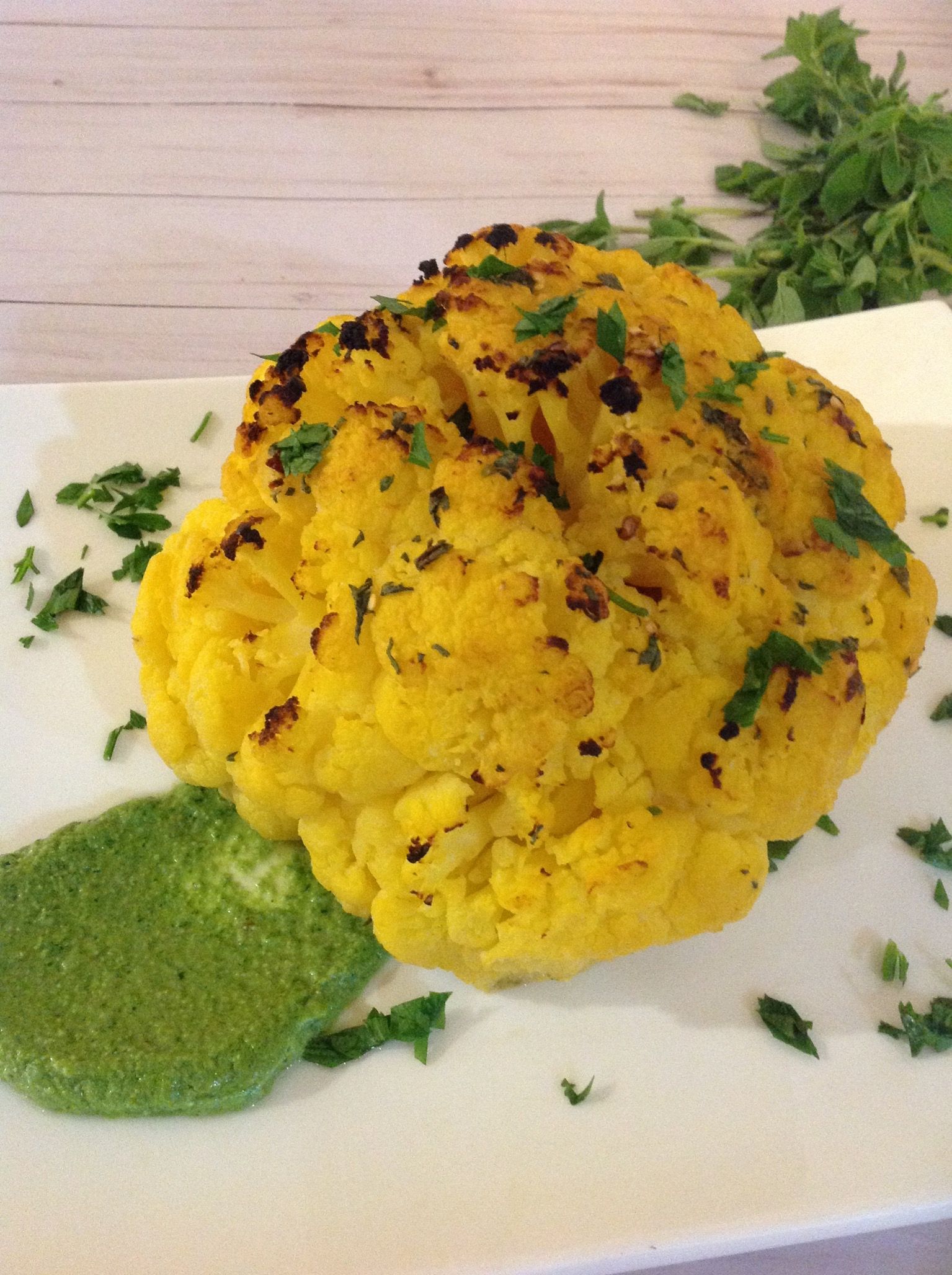 To make the Whole Roasted Argentinian Cauliflower: Bring a large pot of water to a boil. Remove any leaves from the cauliflower and place in the boiling water. Boil for 10-15 minutes, until the thickest part of the stalk is knife-glide tender. Drain and set aside to let cool.